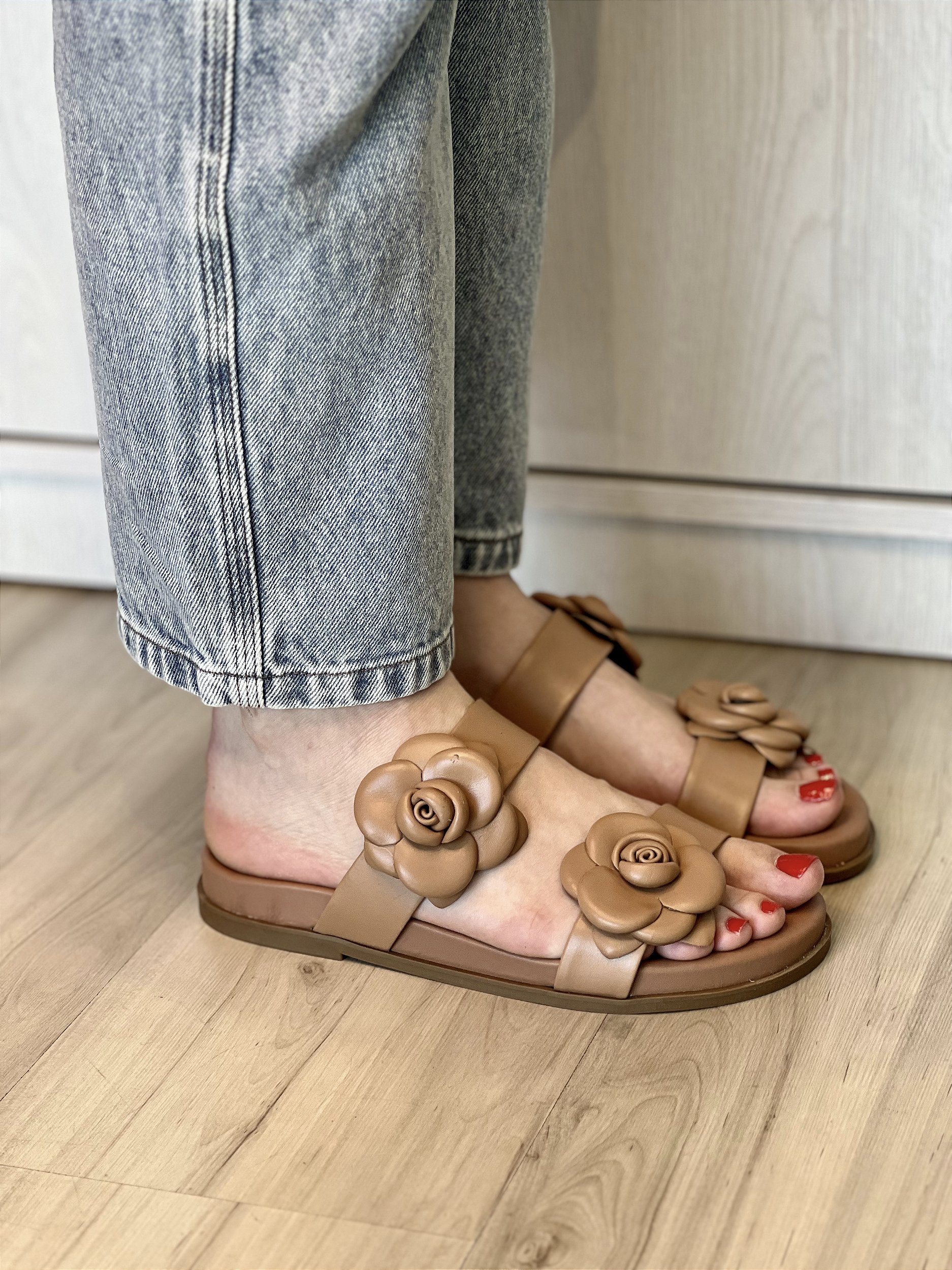 A papete Iris combina suavidade e elegância em um design delicado. Na cor nude, ela traz um toque natural e neutro, perfeito para diversas ocasiões. As flores aplicadas adicionam um charme especial. Confortável e estilosa, a Iris é ideal para quem busca um calçado versátil e sofisticado.