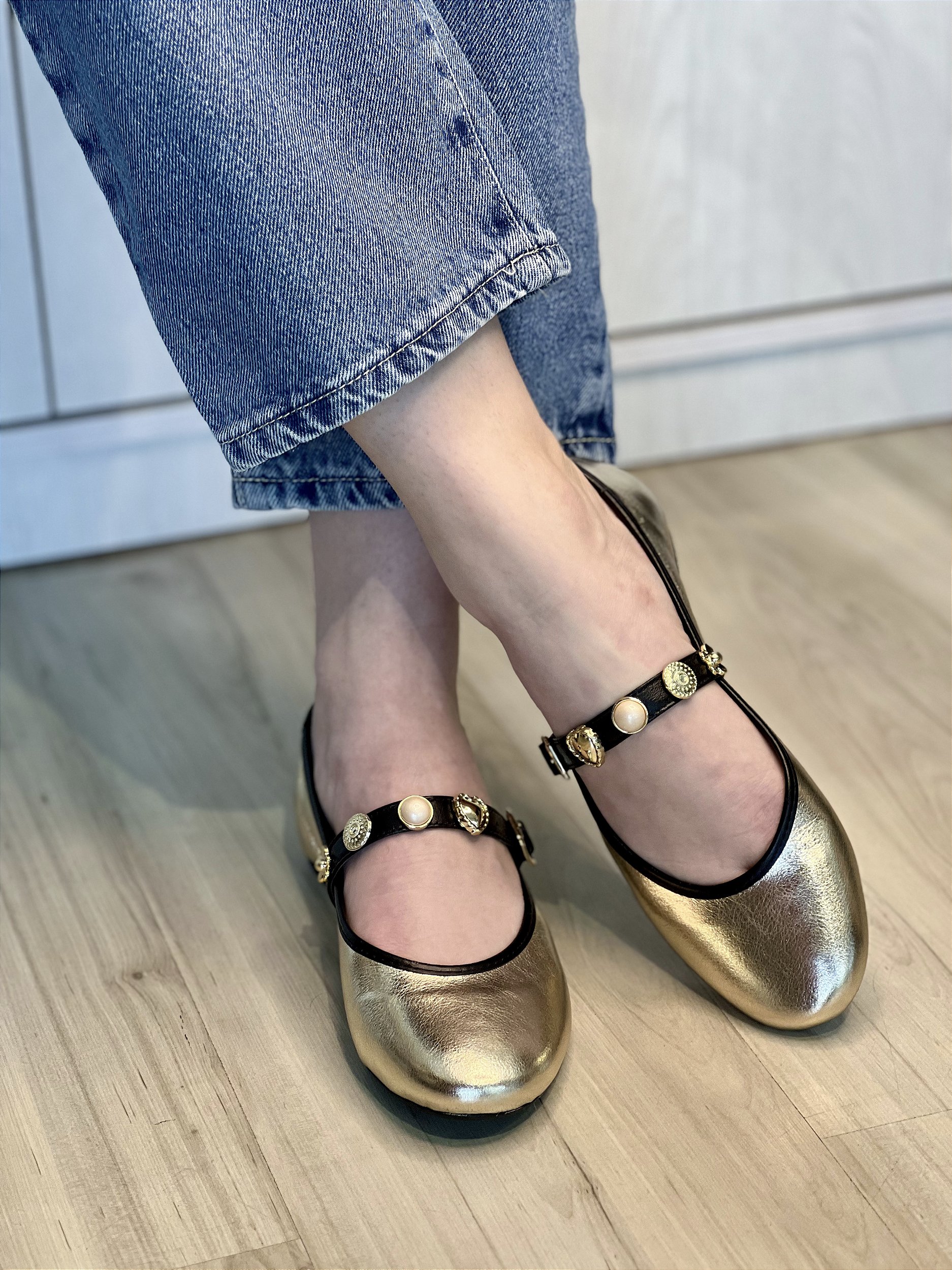 A sofisticação do dourado encontra o conforto da sapatilha. A Lilian traz aplicações delicadas e um design moderno, perfeito para qualquer ocasião.